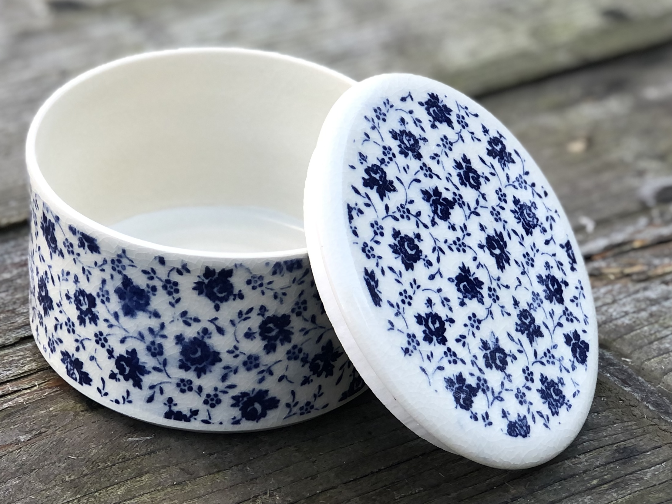 Schattig keramisch bewaardoosje met blauwe bloemetjes afdruk, leuk om cadeau te geven of te krijgen!
