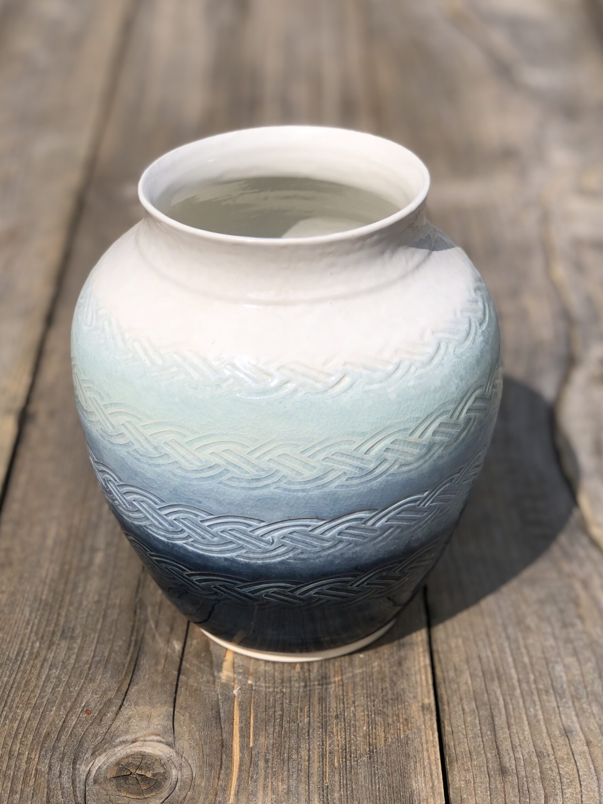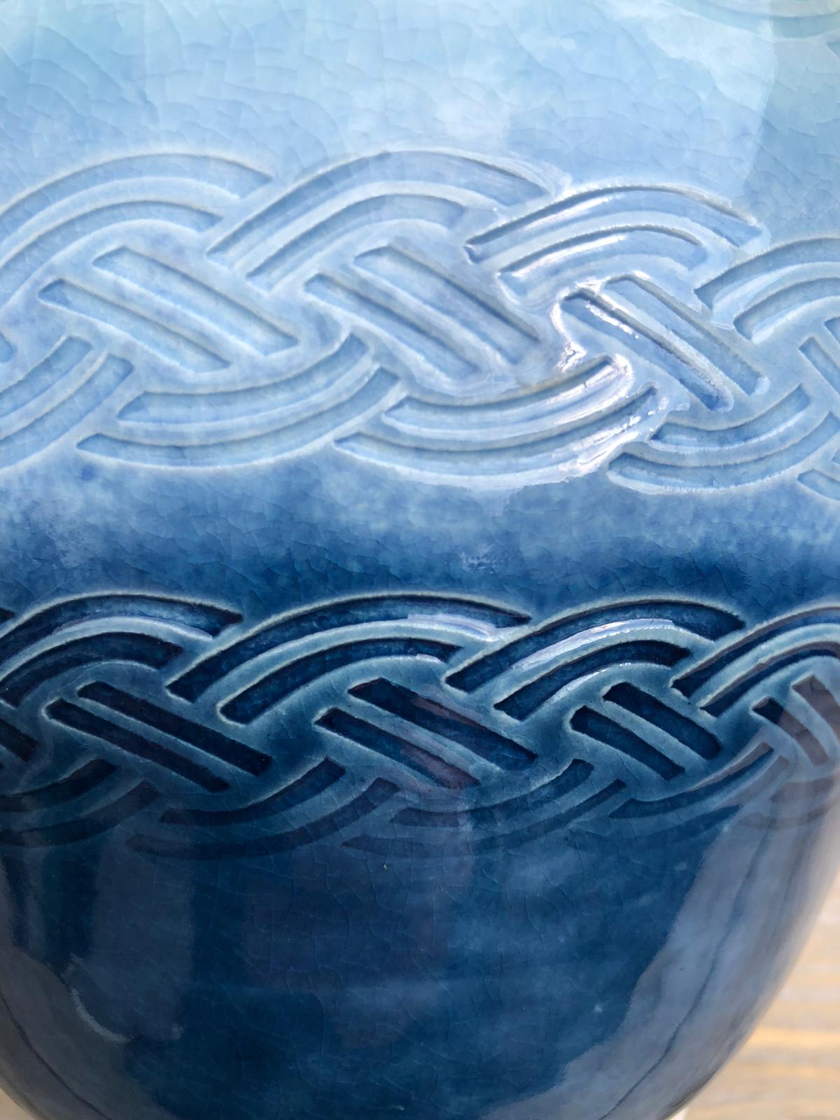 Mooie bolle vaas voor volle boeketten. Donkerblauw, lichtblauw en wit glazuur van beneden naar boven, met textuur dat er doorheen schijnt.
