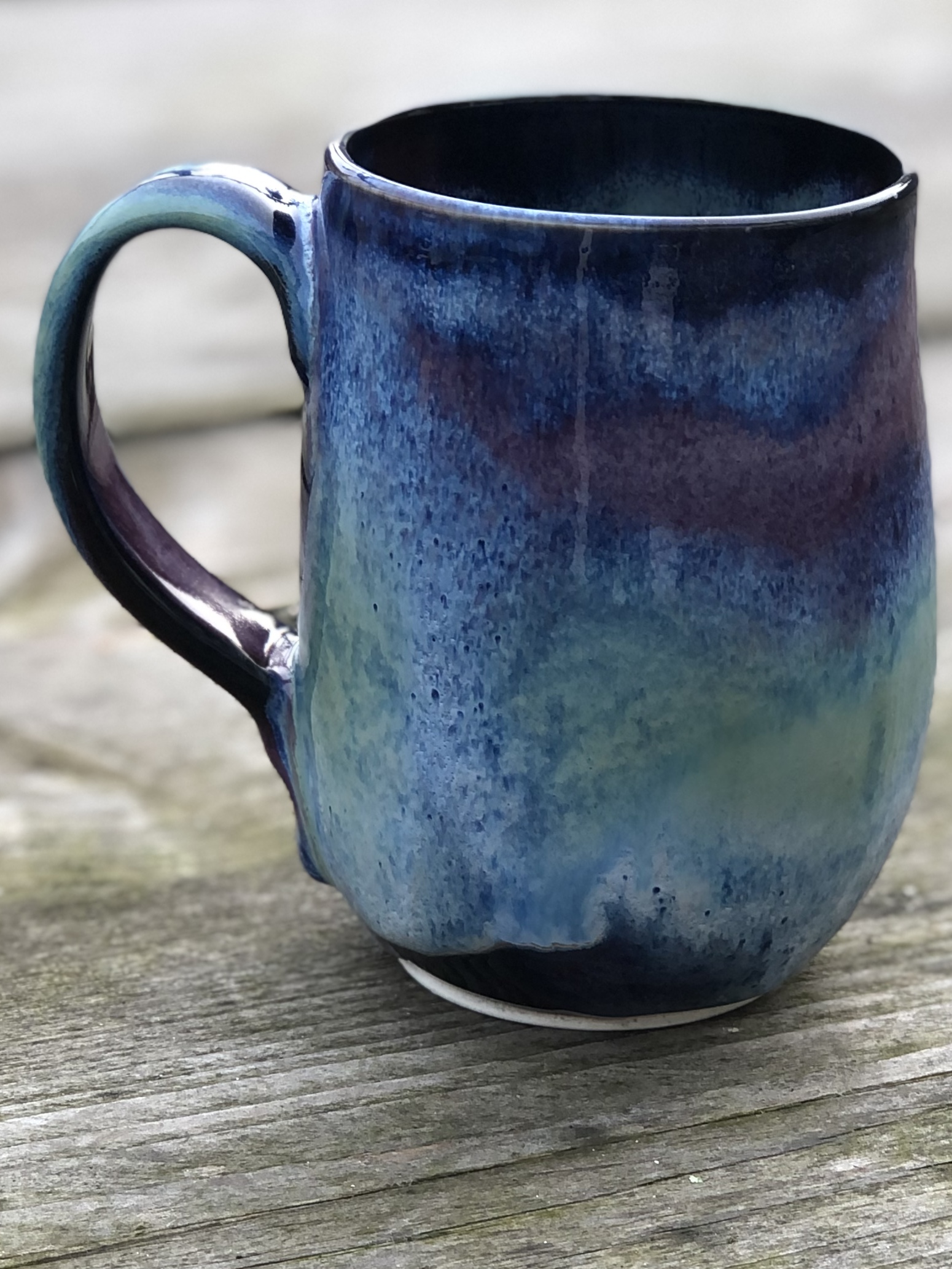 Beker met sierlijk oor en glazuur dat je doet denken aan een ´Galaxy´, of een nacht met noorderlicht. De kleuren zwart, blauw, groen en paars hebben zich met elkaar vermengd tot een prachtig schilderspalet, waarbij elke kant van de beker weer iets anders laat zien.