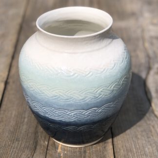 Bolle vaas met verticale strepen die het glazuureffect benadrukken. Een heldere turquoise kleur komt tevoorschijn door de zwarte en donkerblauwe texturen.