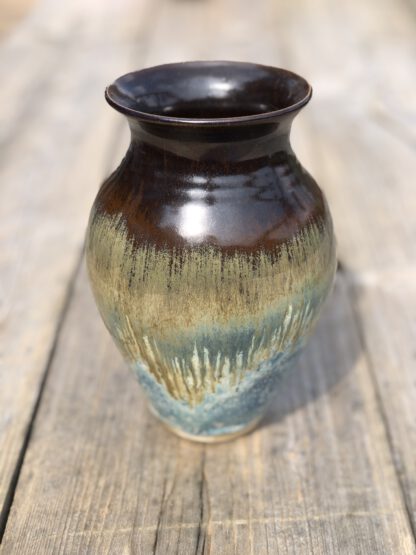Prachtige middelgrote vaas voor boeketten. Donkerbruin loopt over in goudbruin, naar ijsblauw onderaan. De vaas op zichzelf is al een unieke verschijning, maar met een bos bloemen erin komen beiden goed tot zijn recht.